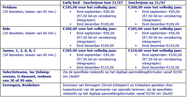 - Tot 16 jaar wordt er gewerkt in leeftijdscategorieën, iedereen danst dan ook bij zijn/haar leeftijdsgenootjes. Uitzonderingen worden niet gemaakt.