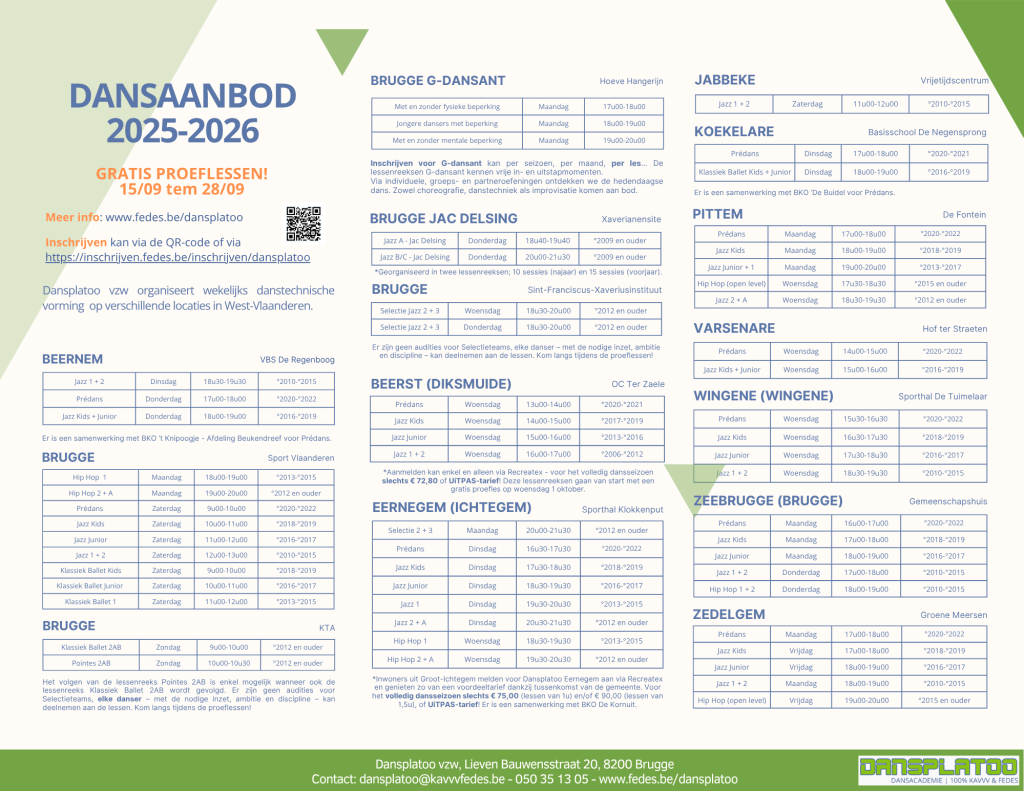 Dansseizoen 2025-2026 gaat van start in de week van maandag 15 september 2025. Aanmelden, voor een gratis proefles tijdens de proeflesweken van maandag 15 september tem zondag 28 september 2025 of meteen voor de volledige lessenreeks, is mogelijk vanaf maandag 2 juni om 18u00 via https://inschrijven.fedes.be/inschrijven/dansplatoo. De inschrijvingen worden definitief afgesloten op zondag 28 september om 23u45; enkel met een stabiele groep kunnen we op niveau danstechnisch ontwikkelen.