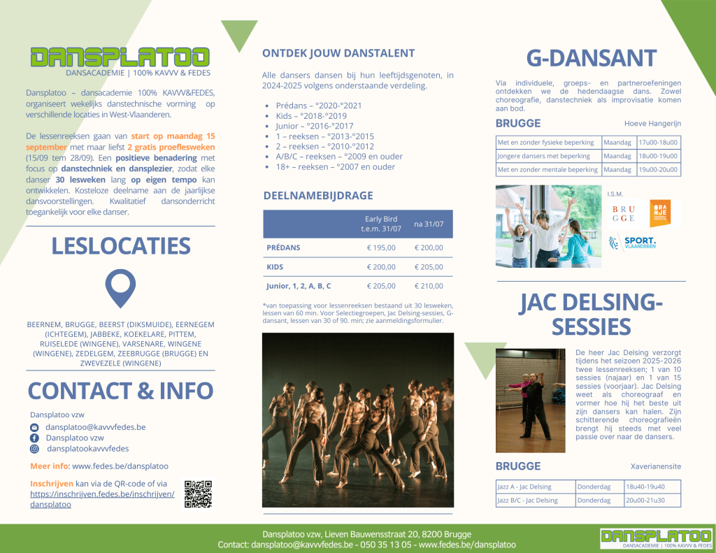 Dansseizoen 2025-2026 gaat van start in de week van maandag 15 september 2025. Aanmelden, voor een gratis proefles tijdens de proeflesweken van maandag 15 september tem zondag 28 september 2025 of meteen voor de volledige lessenreeks, is mogelijk vanaf maandag 2 juni om 18u00 via https://inschrijven.fedes.be/inschrijven/dansplatoo. De inschrijvingen worden definitief afgesloten op zondag 28 september om 23u45; enkel met een stabiele groep kunnen we op niveau danstechnisch ontwikkelen.